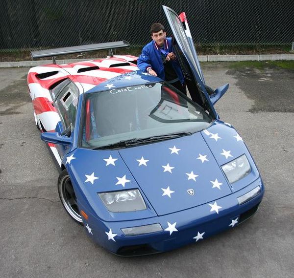 Но нас ждал еще более уникальный автомобиль - Lamborghini Diablo SVR с сумасшедшим двигателем V12, объемом 5.7 литра! Этот монстр, с потрясающим винилом в виде американского флага, пришел с кольцевых автогонок. А чего стоит лишь звук выхлопа? Всё вокруг залито басовитым рычанием, а земля под ногами банально дрожит! Ну а когда я оказался за рулём этого произведения искусства, то мой индикатор счастья подпрыгнул до небес!